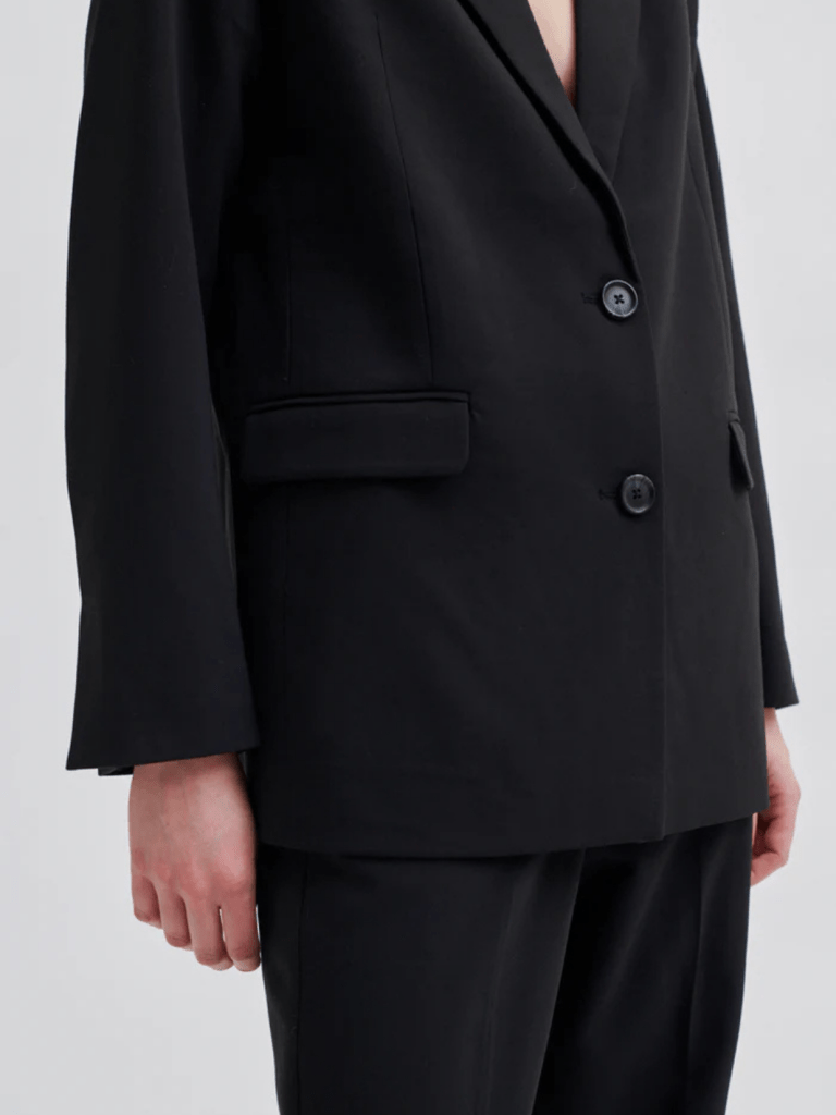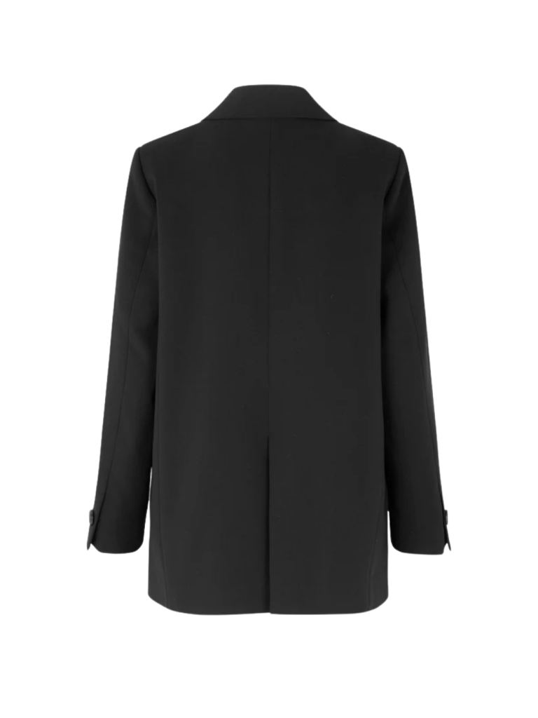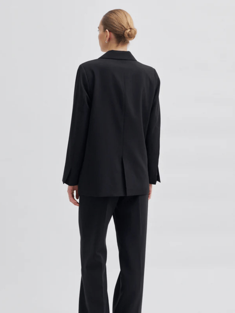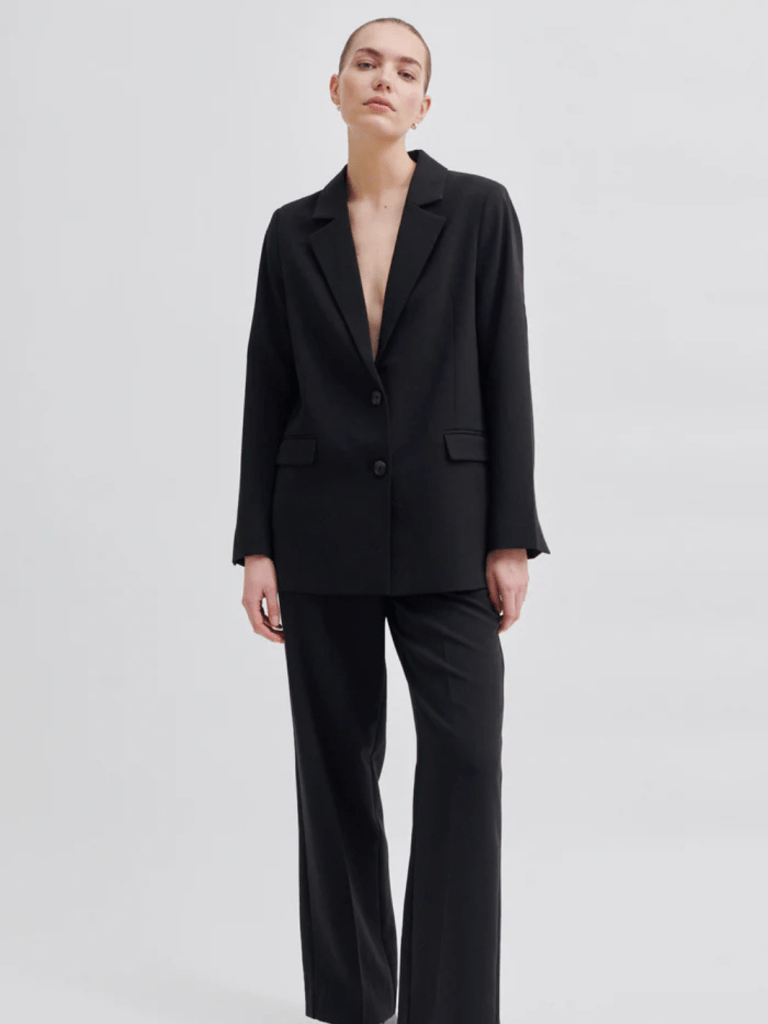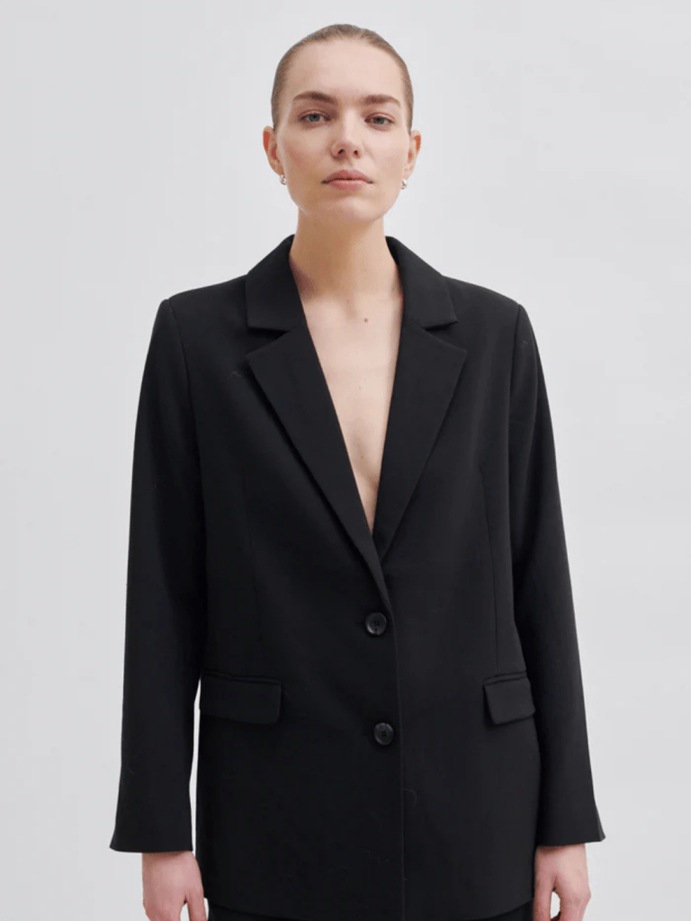 Klassisk og elegant sort Second Female Evie blazer, fremstillet i et let og glat materiale, der falder smukt på kroppen. Blazeren har hakrevers, lukning med to knapper og skulderpuder, som giver et sofistikeret og struktureret look. De lange ærmer med slids, flaplommer og enkelt slids bagpå fuldender designet. Den er helforet og har en løs, afslappet pasform – perfekt til både kontor og hverdagens stilfulde look.