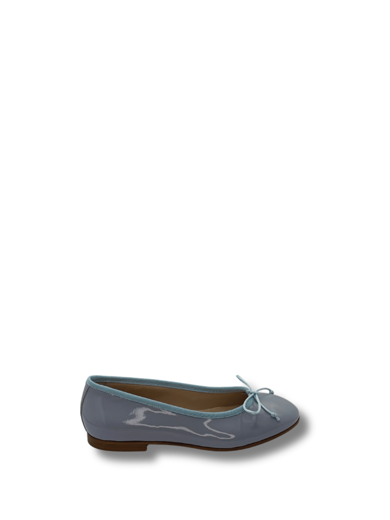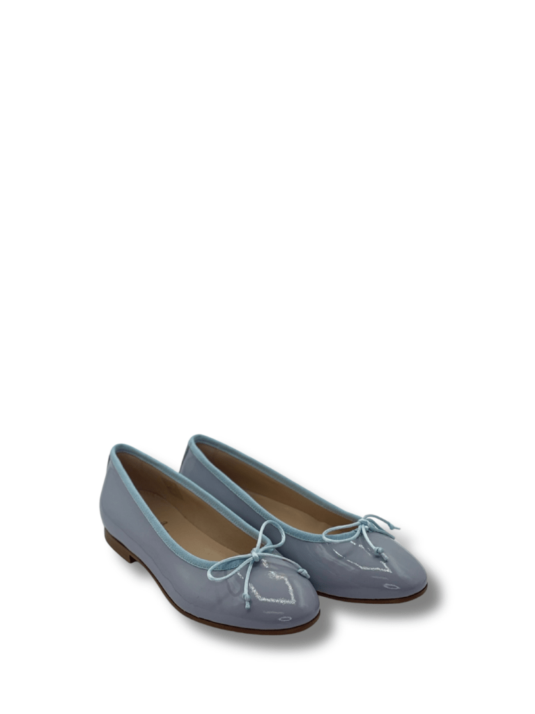 Skønne og super komfortable Apair ballerinaer i lyseblåt skind og lak, og med brune såler. Lille sløjfe på fronten. En rigtig fin sko til alsidigt brug.