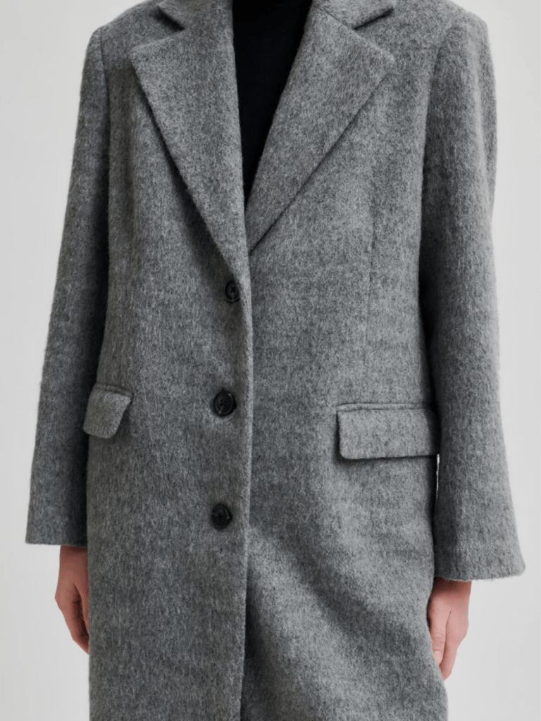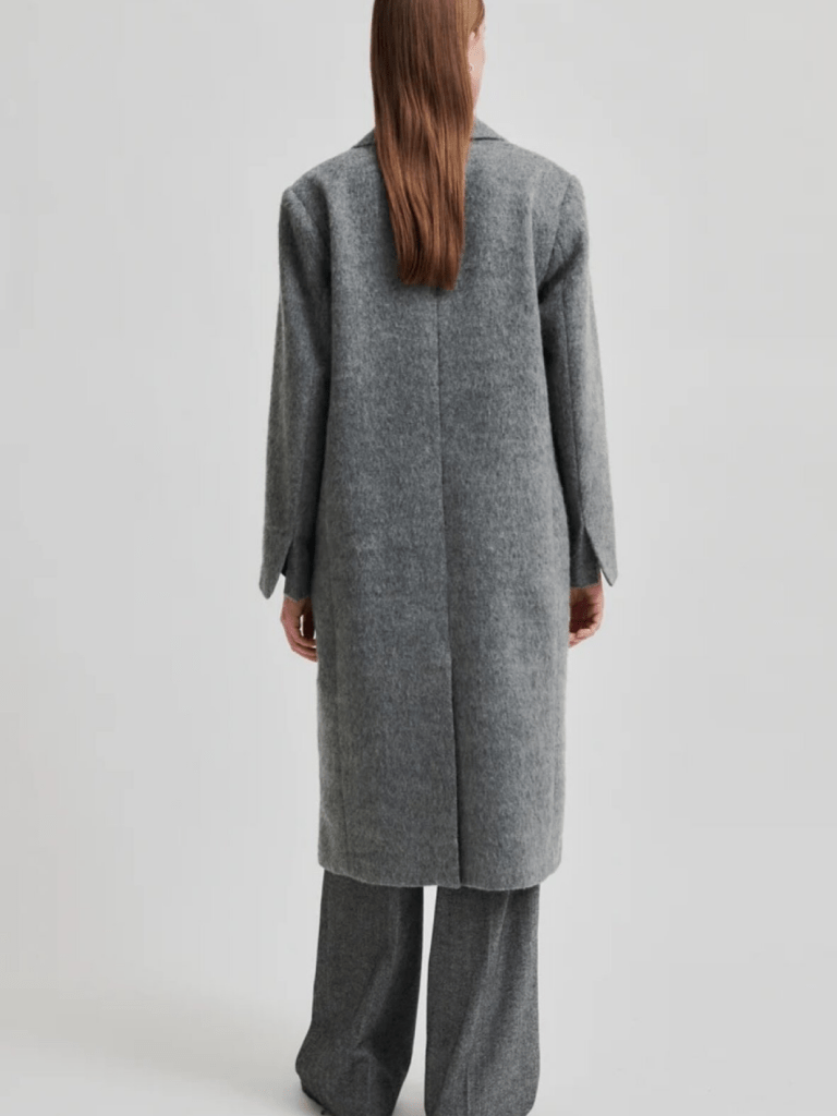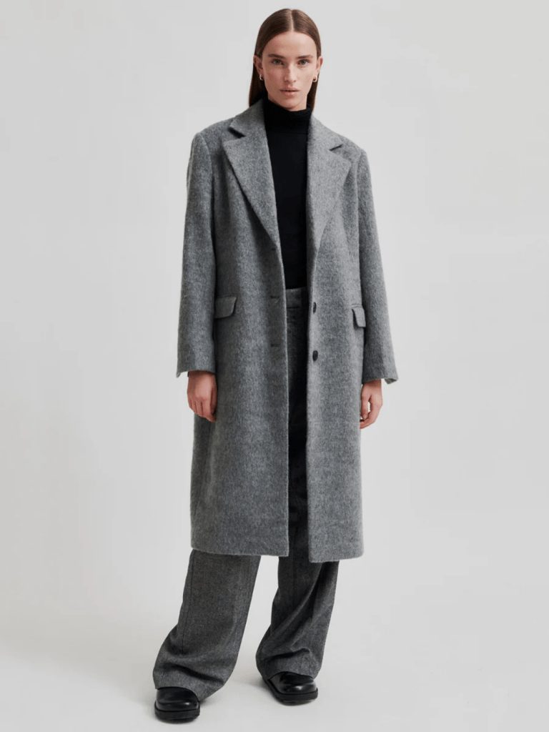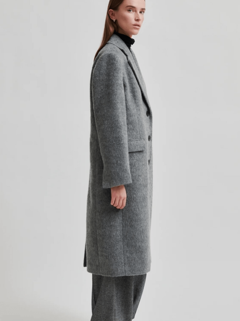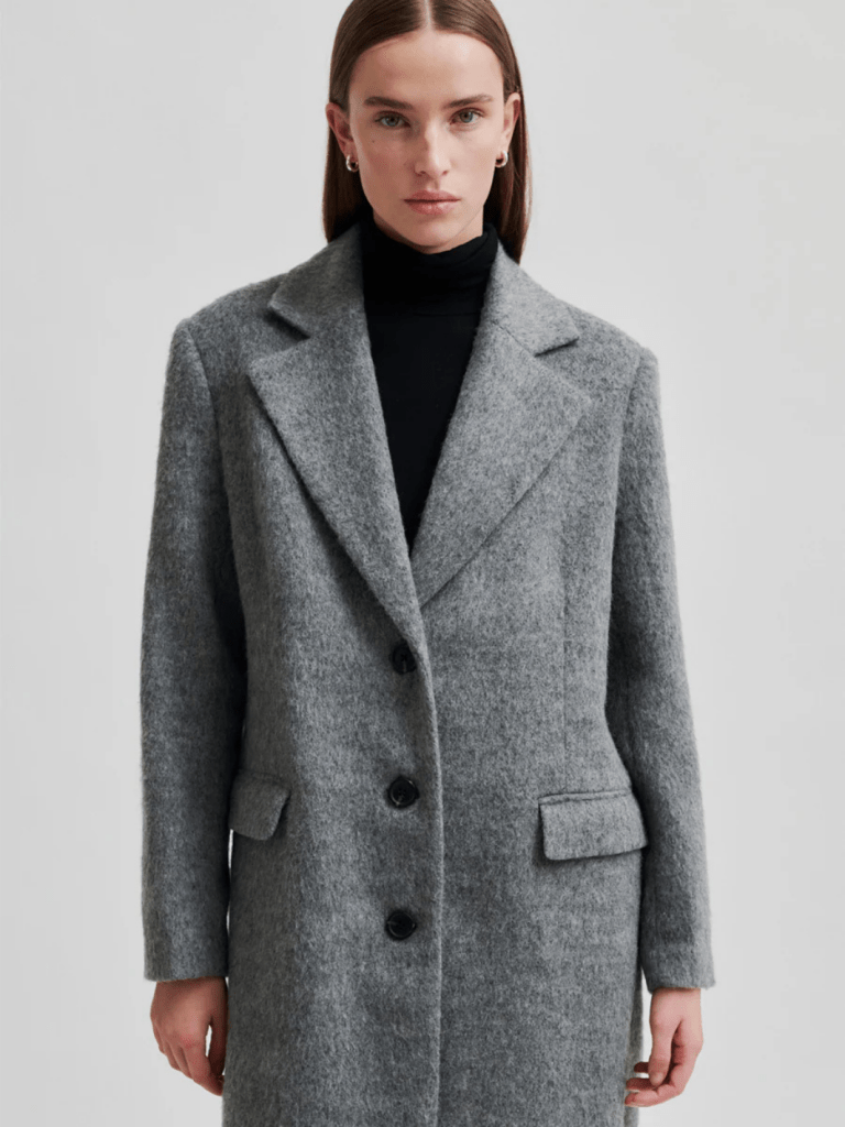 Denne elegante grå Second Female Sera uldfrakke er designet i en blød og kraftig uldblanding med en let tekstureret overflade, der giver et eksklusivt udtryk.