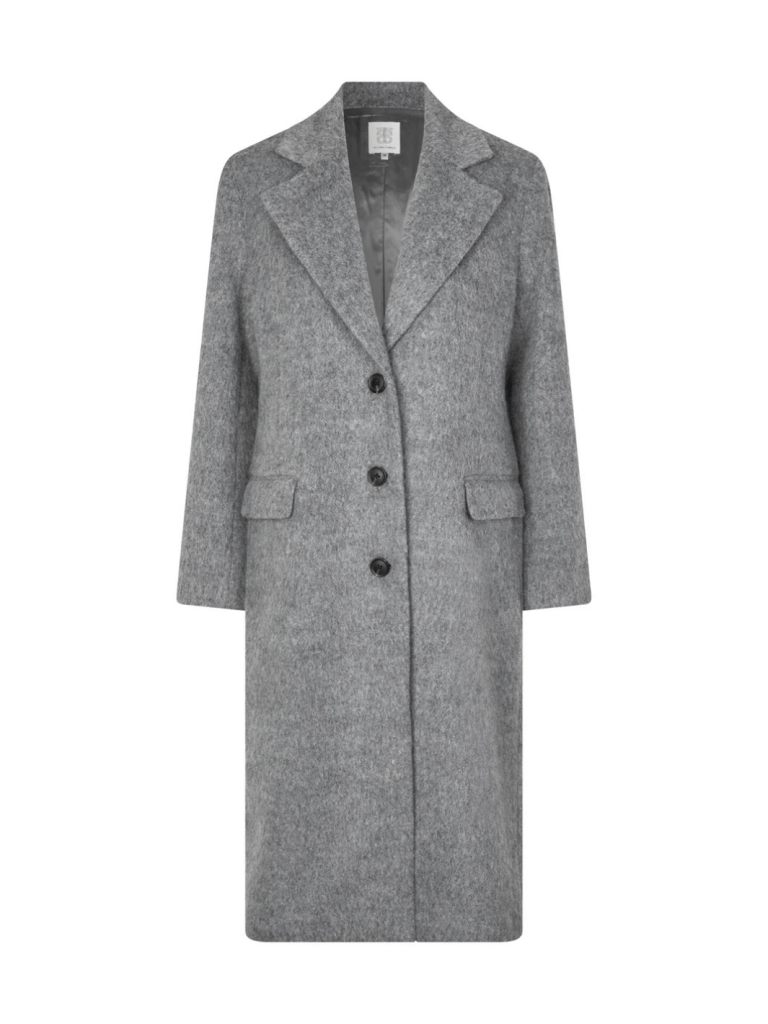 Frakken har en klassisk, lige pasform, bred krave og tre-knaps lukning foran, som giver et tidløst look. De let vatterede skuldre tilfører struktur og et smukt fald, mens de to frontlommer med klap og slids bagpå fuldender det sofistikerede design.