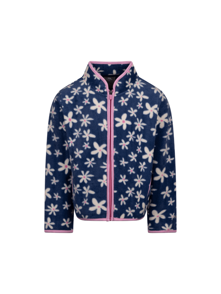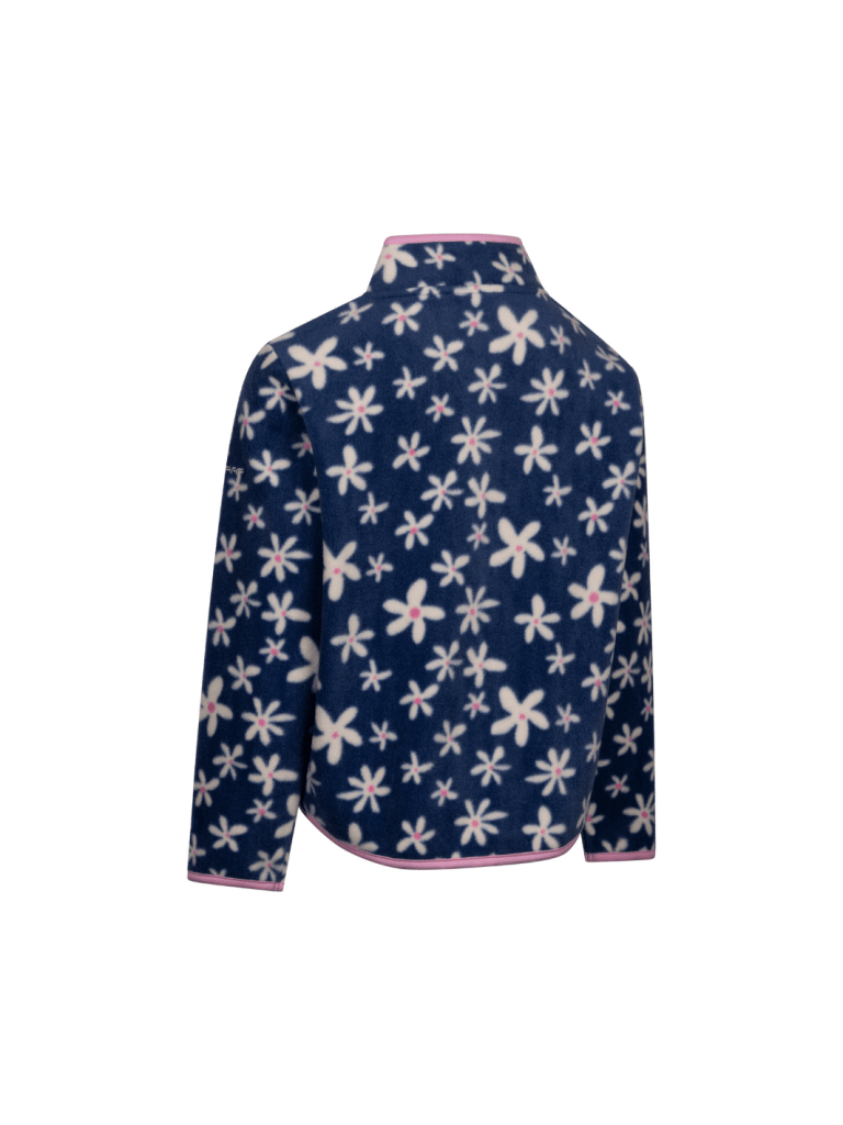 DLX blå Sibyilla fleece til piger. Hold de små varme og hyggelige med denne blå børnefleece med hvide blomster og lyserøde detaljer. Fleecen har fuld lynlås foran, bindedetaljer ved lynlås, krave, manchetter og lommer samt 2 praktiske sidelommer.