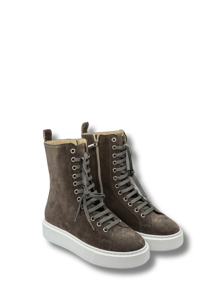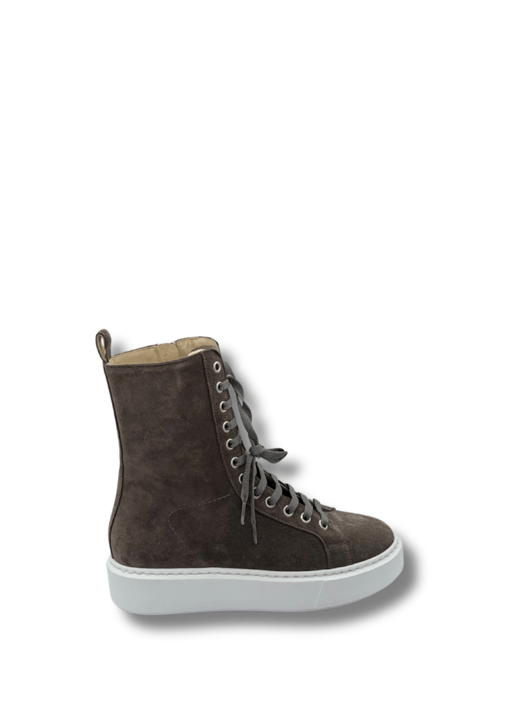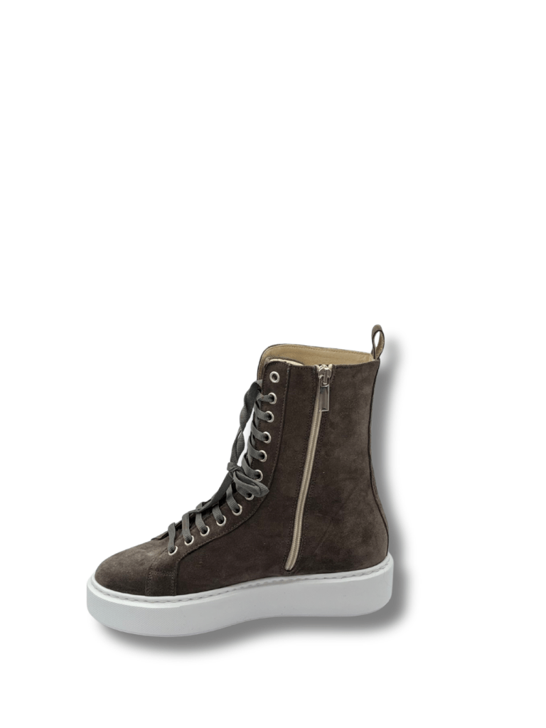 Apair Sally støvle er en halvlang støvle, med lynlås på indersiden samt snørebånd. Støvlen er lavet af ruskind og med tykke hvide gummi såler.
