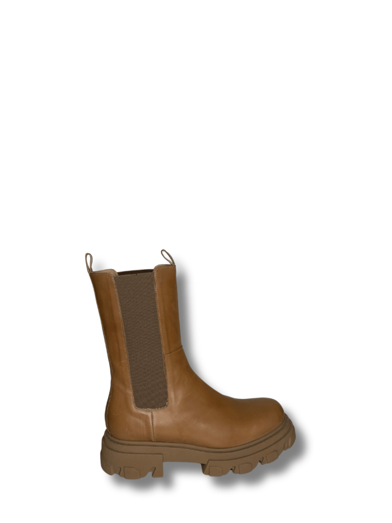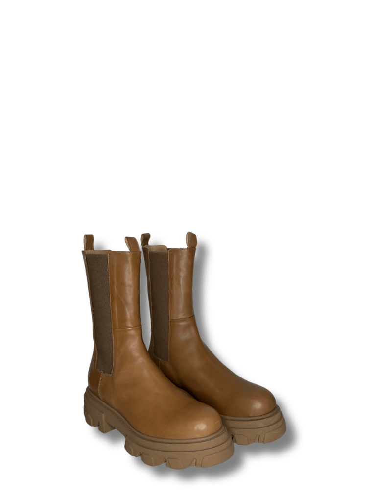 Apair Chelsea støvle. Det er en halvlang støvle lavet af lysebrunt skind og med gummi såler. Støvlen har brunt elastik i begge sider, som gør dem nemme at komme ned i, samt behagelige at have på. 5 cm hæl, 4 cm foran.
