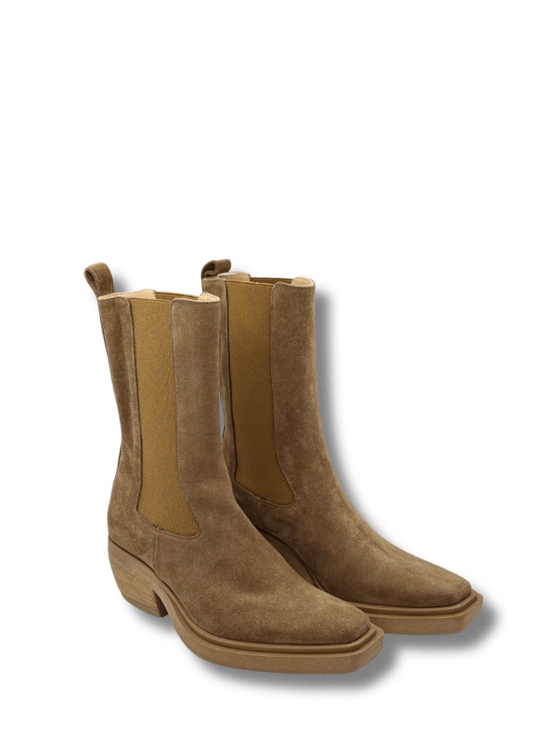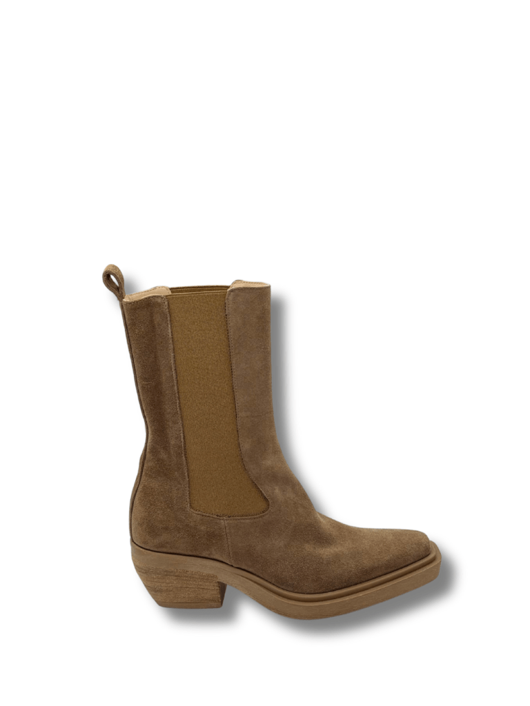 Denne Apair støvle er en elegant og moderne fortolkning på en chelsea- og western-støvle. Støvlen er i fint lysebrunt ruskind og med elestik detaljer i hver side af støvlen, som gør den behagelig at have på, samt nemt at tage på. Støvlen har en kraftig blokhæl i trælook. En sofistikeret, men rå støvle.