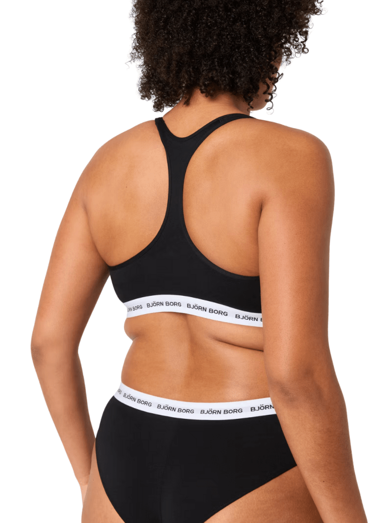 Björn Borg Core Logo Soft Top i sort. En hverdagssports-bh lavet af et kvalitetsstof af blødt bomuld med stræk. Den har bryderryg, afrundet hals og lav støtte, med en tynd og blød logoelastik omkring torsoen.