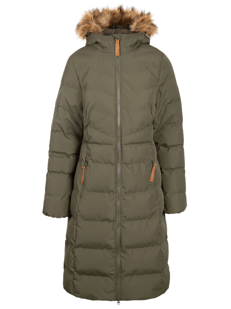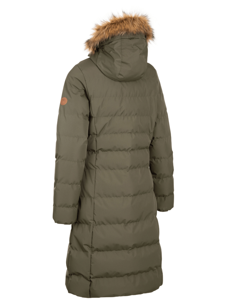 Härlig armégrön lätt quiltad kappa från populära Trespass. Pälsen har COLDHEAT-isolering, en lätt isolering som håller kvar din kroppsvärme. Det finns två sidfickor, en kraftig omvänd dragkedja fram och avtagbar fuskpäls. Kappan är lätt åtsittande och går långt ner på ryggen.