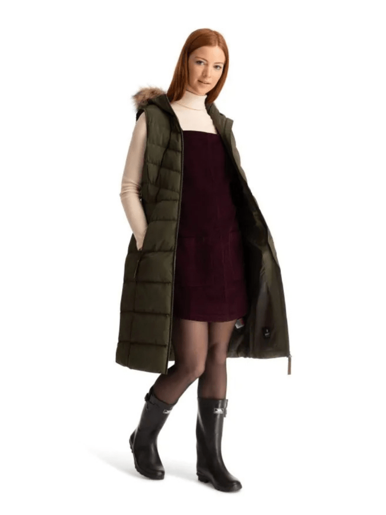 Lækker Armygrøn  Audrey Gilet letvægts Dynevest fra populære Trespass. Vesten er med COLDHEAT isolering, en let isolering der holder på din kropsvarme. Der er to sidelommer, kraftig reverse frontlynlås, aftagelig kunstig pels. Vesten er lettere taljeret og går langt ned over bagen.