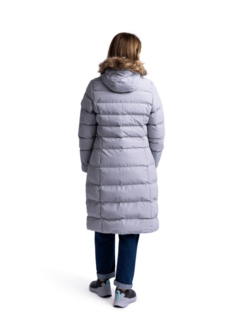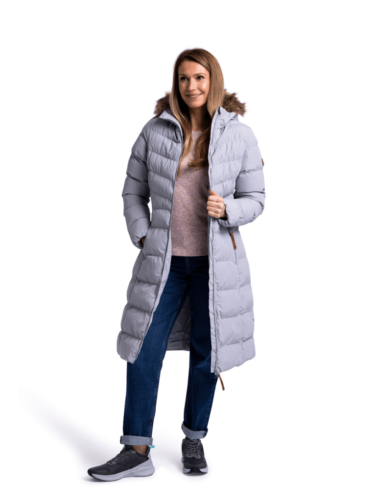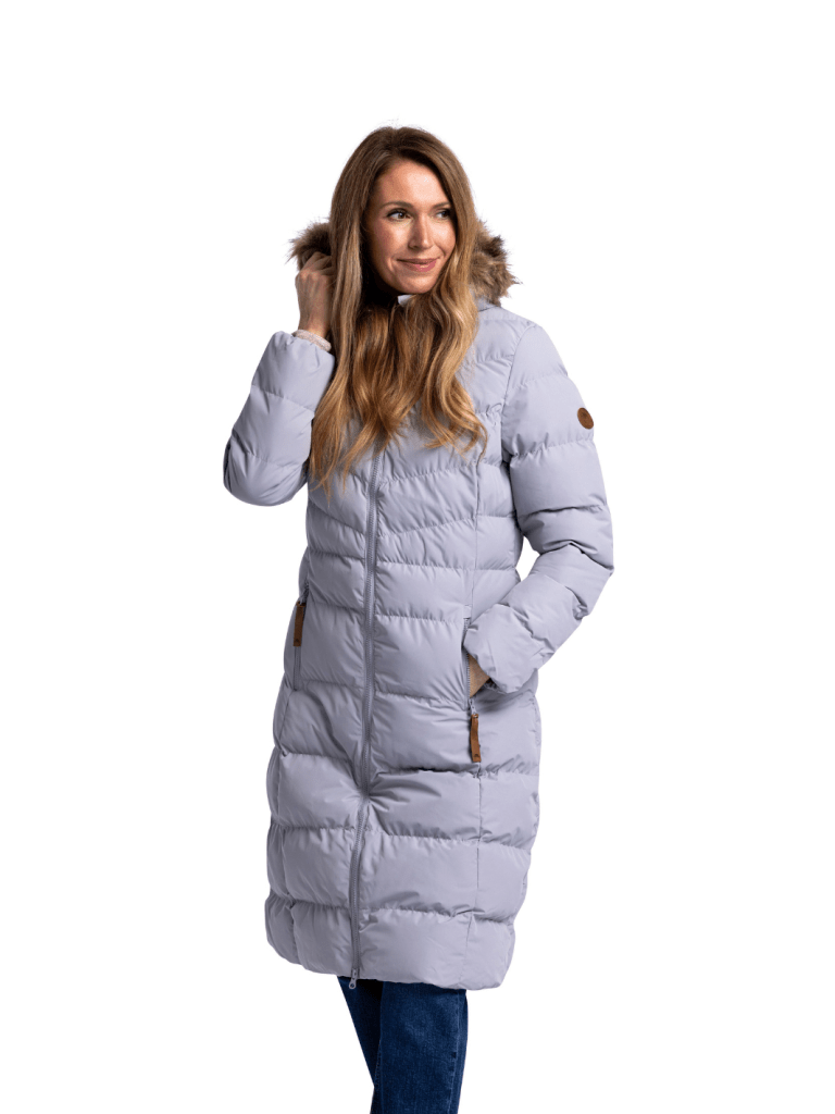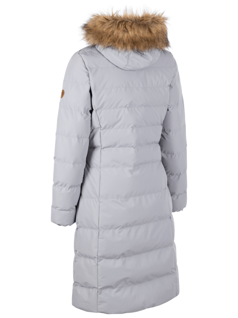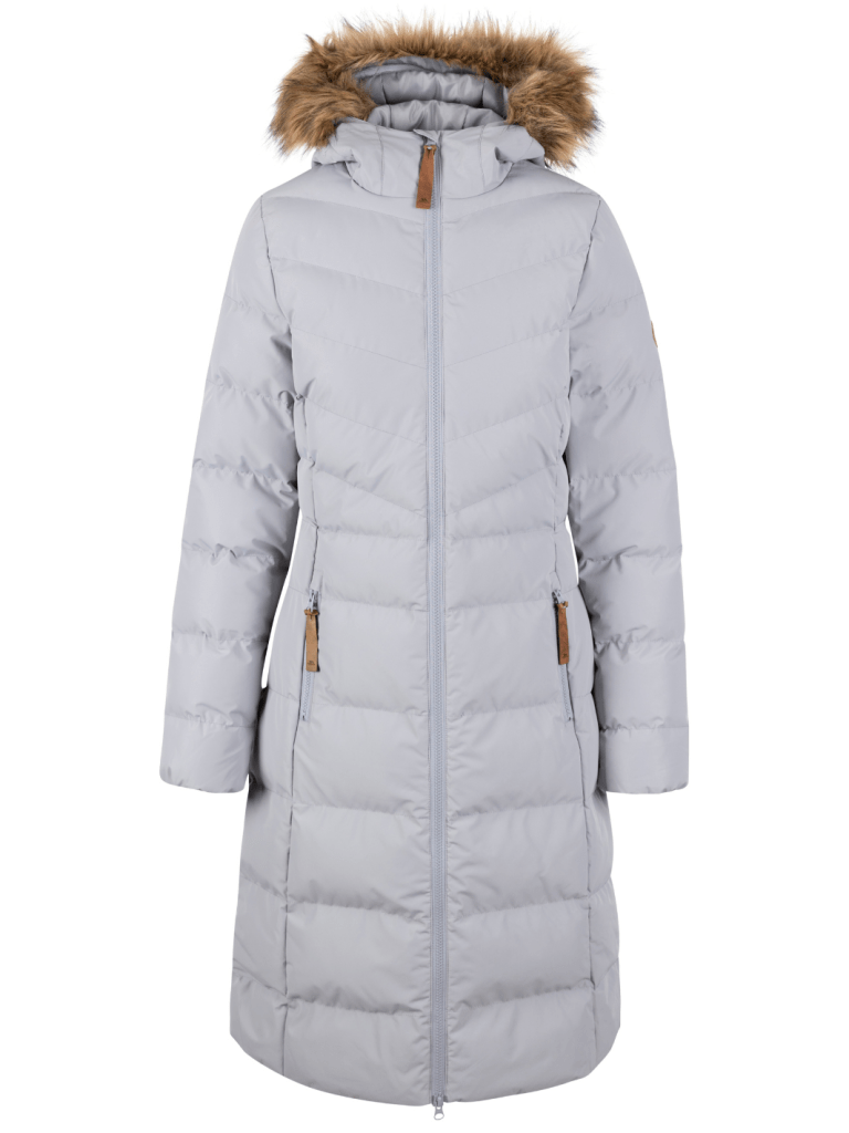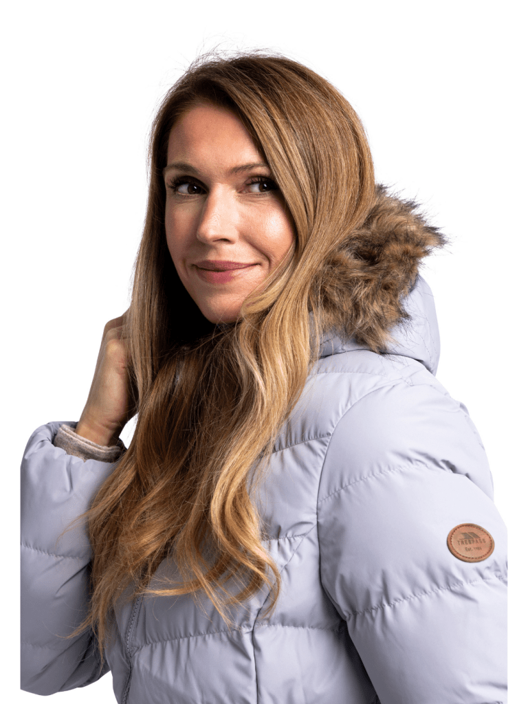 Lækker lysegrå letvægts Dynefrakke fra populære Trespass. Frakken er med COLDHEAT isolering, en let isolering der holder på din kropsvarme. Der er to sidelommer, kraftig reverse frontlynlås, aftagelig kunstig pels. Frakken er lettere taljeret og går langt ned over bagen.