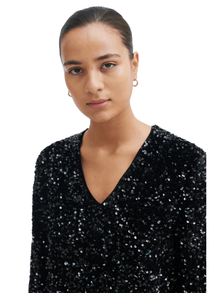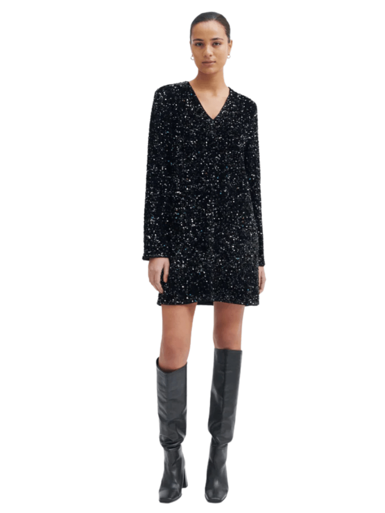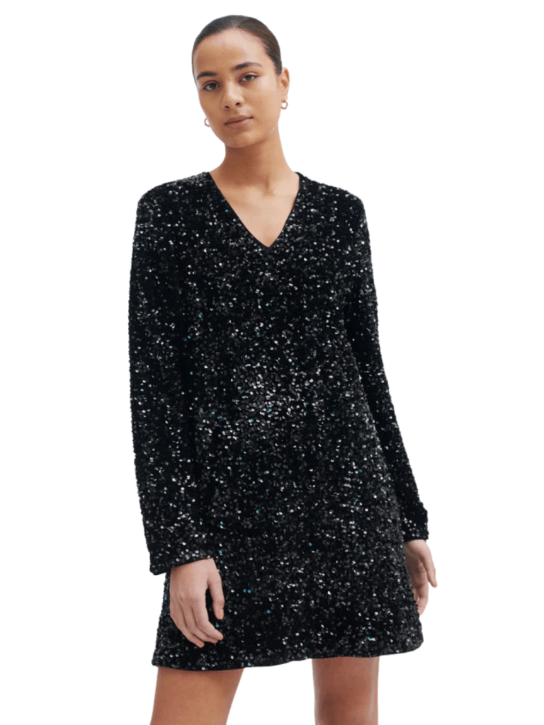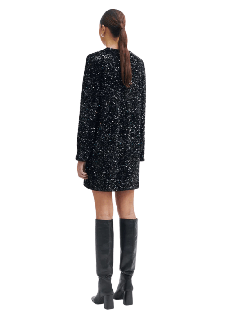 Second Female Shimmer Glimmer Kjole i sort. Små, runde pailletter over det hele på halvgennemsigtig mesh. Høj hals og åbning bagpå med lynlås. Helforet. Den Perfekte kjole til fest!