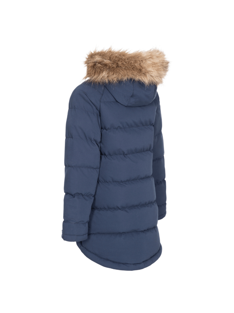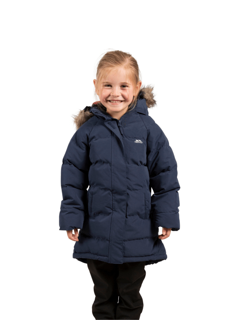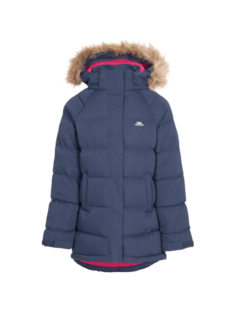 Mørkeblå Trespass Unique Dynejakke. Denne vandafvisende, polstrede pigejakke er skabt i 100% polyester mikrofiber TPU, som både giver varme og beskyttelse mod vind og vejr. En funktionel og stilfuld jakke, perfekt til piger, der elsker at være ude – uanset årstiden.